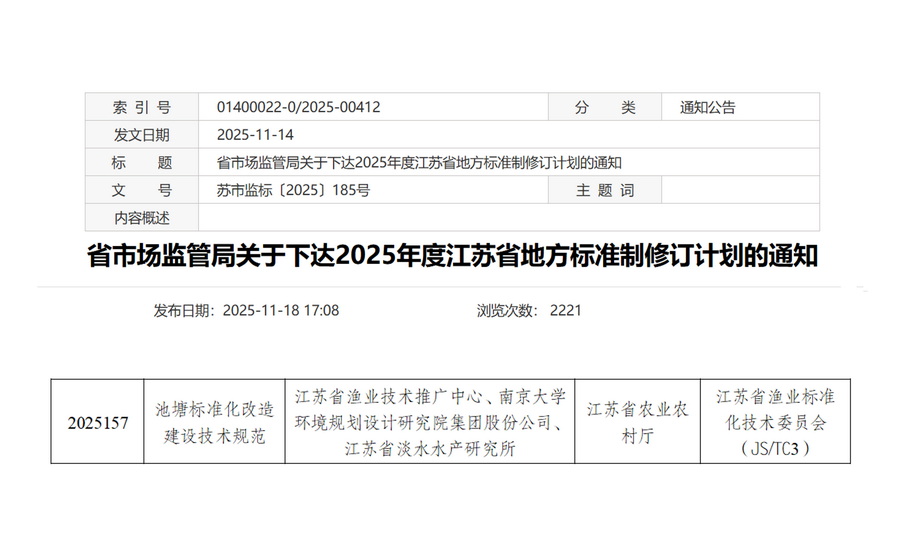 2026年2月5日,由省渔业技术推广中心、南大环规院工程设计研究院、省淡水水产所编制的江苏省地方标准---《池塘标准化改造建设技术规范》 在鼓楼校区召开开题立项会。中国水产科学研究院、江苏省环境监测中心、江苏省渔业标准化技术委员会、南京市水产科学研究所、淮安市洪泽区水产技术推广站5位专家受邀参会,对标准开题相关材料进行审议,并一致同意该标准通过开题立项。